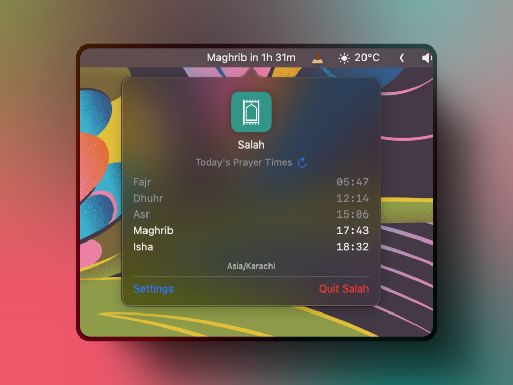 This macOS app displays the upcoming prayer time and its countdown directly in your menu bar. With a single click, access a daily prayer schedule tailored precisely to your current location, wherever you may be in the world.